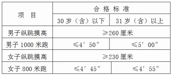 報(bào)名資格初審合格的考生方可參加體能測(cè)試(初定于10月28日左右進(jìn)行測(cè)試,請(qǐng)?zhí)崆白龊脺?zhǔn)備)。測(cè)試項(xiàng)目和標(biāo)準(zhǔn)如下,其中“縱跳摸高”當(dāng)場(chǎng)測(cè)試不超過(guò)三次,“男子1000米跑”“女子800米跑”只允許當(dāng)場(chǎng)測(cè)試一次。結(jié)果分為合格和不合格。
