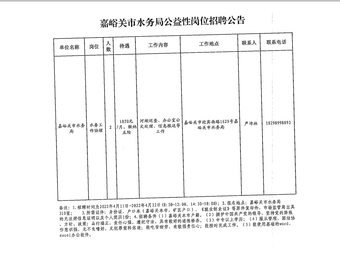 2022-04-23 23:19:21閱讀()嘉峪關(guān)市水務(wù)局2022年嘉峪關(guān)市水務(wù)局公益性崗位招聘公告