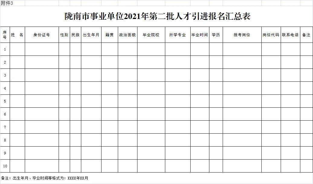 3.報名材料?,F(xiàn)場報名人員須持畢業(yè)證(含電子注冊備案表)、學(xué)位證、報到證、身份證原件及復(fù)印件,《隴南市事業(yè)單位2021年第二批人才引進報名表》(附件2),《隴南市事業(yè)單位2021年第二批人才引進報名匯總表》(附件3),近期2寸正面免冠藍底彩色照片電子版(JPG格式)。除上述材料,留學(xué)人員要提供由教育部出具的境外學(xué)歷、學(xué)位認證書及駐外大使館留學(xué)回國人員證明。網(wǎng)上報名人員要建立一個以“報名人員姓名+崗位代碼”為名的文件夾,如王XX(A001)。文件夾中包含現(xiàn)場報名人員提交所有材料的彩色掃描件,其中附件2、附件3須提供電子版。