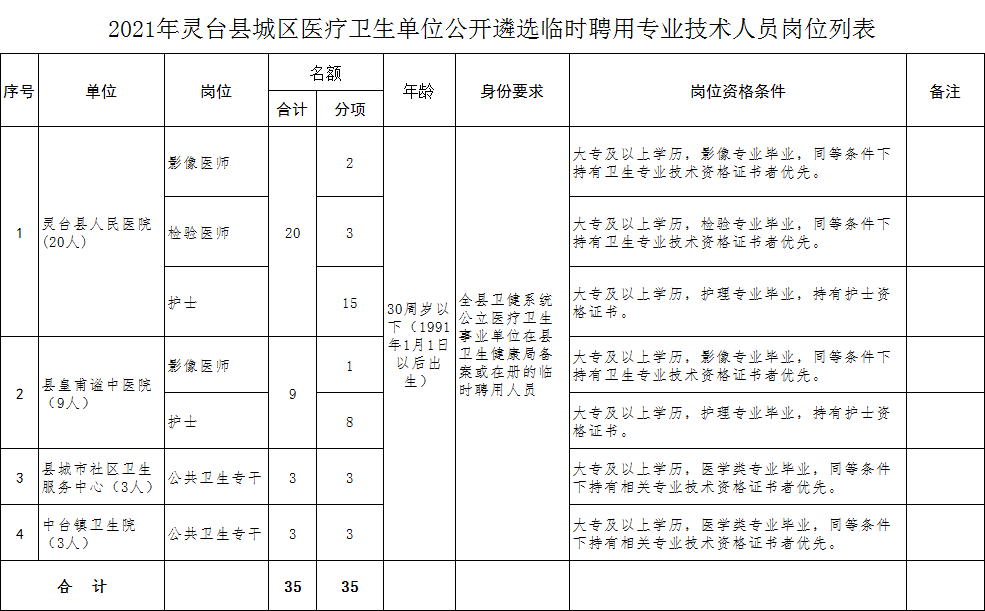 2021-01-24 21:44:16閱讀()甘肅·靈臺(tái)根據(jù)工作需要,按照《靈臺(tái)縣衛(wèi)健系統(tǒng)事業(yè)單位一般工作人員交流調(diào)配工作實(shí)施辦法(試行)》規(guī)定,經(jīng)用人單位申請(qǐng),縣衛(wèi)生健康黨工委會(huì)議研究,決定在全縣衛(wèi)健系統(tǒng)公立醫(yī)療衛(wèi)生事業(yè)單位臨時(shí)聘用人員中為縣人民醫(yī)院、縣皇甫謐中醫(yī)院、縣城市社區(qū)衛(wèi)生服務(wù)中心、中臺(tái)鎮(zhèn)衛(wèi)生院4個(gè)醫(yī)療衛(wèi)生事業(yè)單位公開(kāi)遴選臨時(shí)聘用專業(yè)技術(shù)人員35名?,F(xiàn)將有關(guān)事項(xiàng)公告如下: