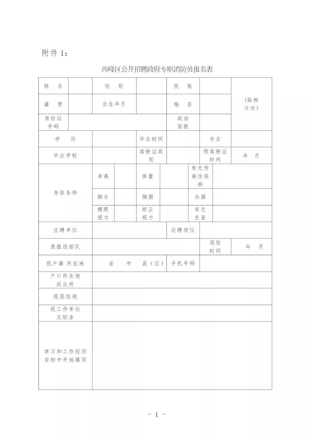 附件1:《西峰區(qū)公開招聘政府專職消防員報(bào)名表》