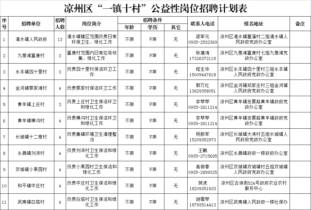 2.報(bào)名地點(diǎn):詳見(jiàn)《涼州區(qū)“一鎮(zhèn)十村”公益性崗位招聘計(jì)劃表》;