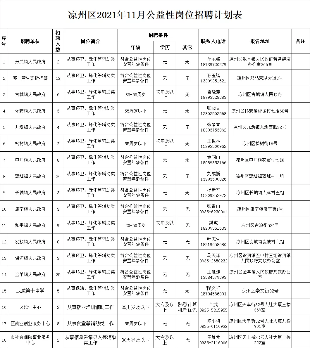 2.報(bào)名地點(diǎn):詳見(jiàn)《涼州區(qū)2021年11月公益性崗位招聘計(jì)劃表》;