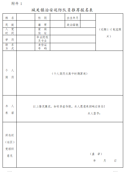 附件1:《城關(guān)鎮(zhèn)治安巡防隊員推薦報名表》