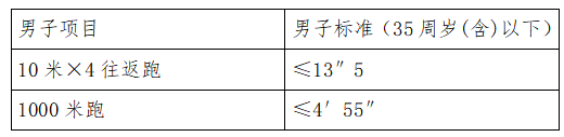 根據(jù)面試成績,按照招聘崗位數(shù)1:1.5的比例從高分到低分的順序確定體能測試人選。具體測試內(nèi)容及標(biāo)準(zhǔn)如下: