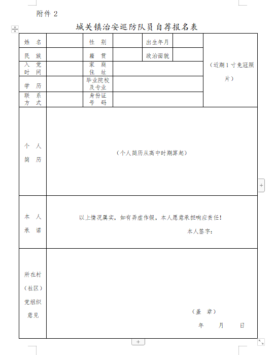 附件2:《城關(guān)鎮(zhèn)治安巡防隊員自薦報名表》