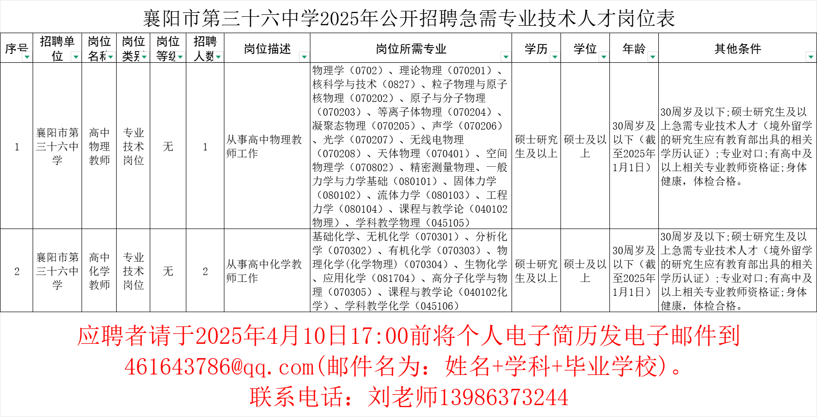 詳見《襄陽市第三十六中學(xué)2025年公開招聘急需專業(yè)技術(shù)人才崗位表》。