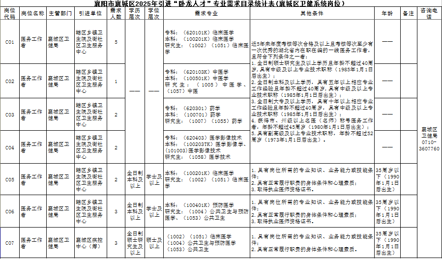 2025-06-06 14:42:00閱讀()襄陽市衛(wèi)生健康委員會襄陽市襄城區(qū)2025年度計劃引進“臥龍人才”91名。其中,C類崗位為優(yōu)秀醫(yī)務工作者引才,共引進18名。其中,C01-C04崗面向湖北省內(nèi)在職在編、專業(yè)技術(shù)精湛的一線醫(yī)務工作者,引進10名;C05-C06崗面向普通高校全日制本科及以上學歷畢業(yè)生,并取得相應學歷學位,同時需取得執(zhí)業(yè)醫(yī)師資格證書,引進5名;C07崗面向國內(nèi)普通高?;蚝M庵咝H罩拼T士研究生及以上學歷的應屆、往屆畢業(yè)生,引進3名。