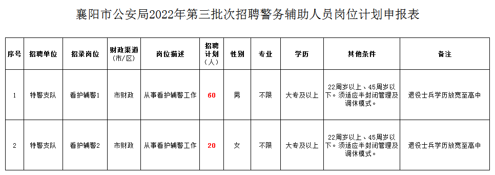 招聘計劃本次公開招聘看護輔警80名,男性60名、女性20名。具體如下: