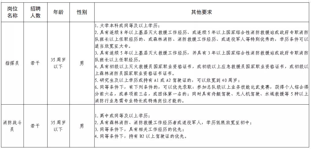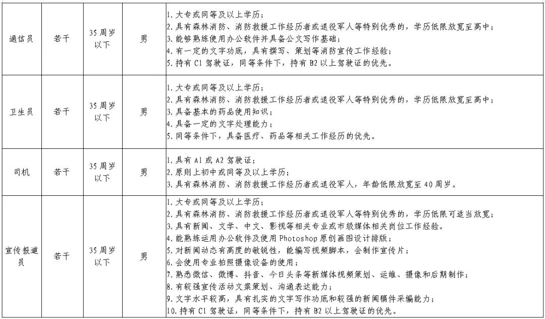 公開招聘森林消防員若干,招聘崗位及崗位要求詳見下表: