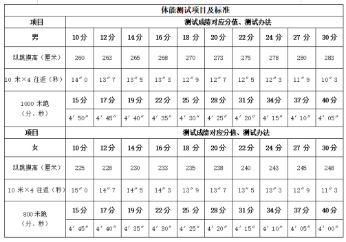 3. 體能測(cè)試: 按照縱跳摸高、10米×4折返跑、男子1000米跑、女子800米跑順序進(jìn)行,滿分100分。詳情如下: