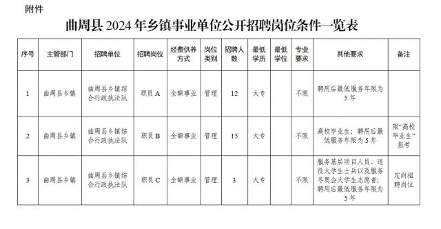 本次招聘崗位為曲周縣鄉(xiāng)鎮(zhèn)全額事業(yè)編制工作人員30名,其中,限“高校畢業(yè)生”報考崗位15名,定向招聘崗位3名。招聘人數(shù)、具體崗位、資格條件詳見《曲周縣2024年鄉(xiāng)鎮(zhèn)事業(yè)單位公開招聘崗位條件一覽表》。