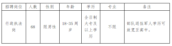 2023-08-11 19:42:30閱讀()中國雄安為扎實做好容東城市管理工作,充實綜合執(zhí)法隊伍力量,充分發(fā)揮綜合執(zhí)法在工作中的重要作用,根據(jù)容東綜合執(zhí)法隊伍目前崗位空缺情況和隊伍建設(shè)需要,特面向社會招聘容東片區(qū)綜合執(zhí)法輔助人員68名,現(xiàn)將有關(guān)事項公告如下: