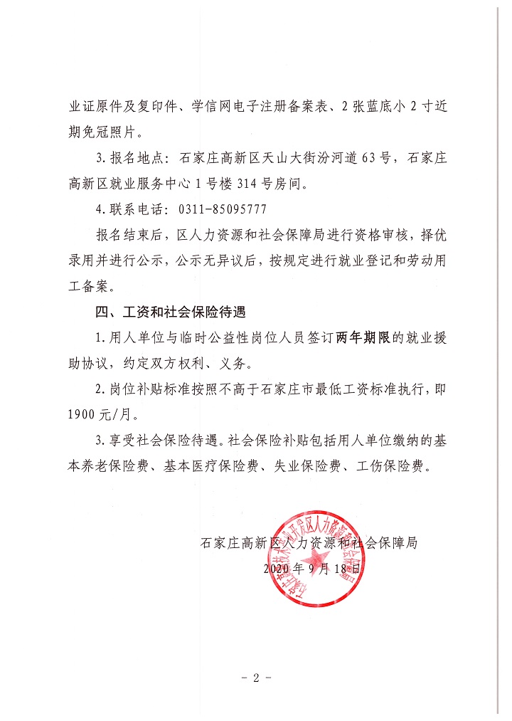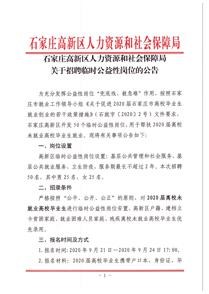 2020年石家莊高新區(qū)人力資源和社會(huì)保障局招聘臨時(shí)公益性崗位公告
