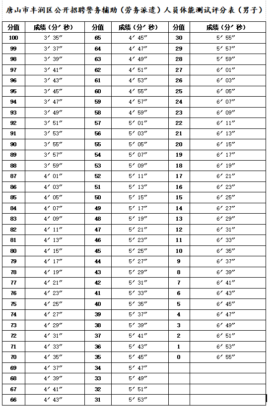 (3)測試成績。參考《公安機(jī)關(guān)錄用人民警察體能測評項(xiàng)目和標(biāo)準(zhǔn)》制定《唐山市豐潤區(qū)公開招聘警務(wù)輔助(勞務(wù)派遣)人員體能測評評分表》(見附件),總分100分,根據(jù)體能測評所用時間確定排名順序。未跑完全程不計成績。體能測評成績0分的為不合格成績,不進(jìn)入下一環(huán)節(jié)。體能測評成績通過“豐潤人才發(fā)展集團(tuán)公開招聘 (http://gkks.frrcjt.com/)”發(fā)布。