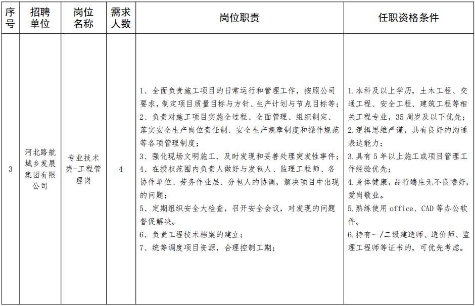 邢臺(tái)路橋建設(shè)集團(tuán)有限公司、河北路航實(shí)業(yè)集團(tuán)有限公司2家集團(tuán)所屬企業(yè)共招聘4崗30名工作人員。招聘崗位及相關(guān)要求詳見(jiàn)附件《邢臺(tái)市交通建設(shè)集團(tuán)有限公司2024年度社會(huì)招聘所屬企業(yè)崗位簡(jiǎn)要》