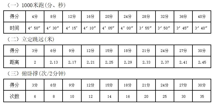 測試科目為1000米跑、立定跳遠(yuǎn)、俯臥撐,總成績100分。