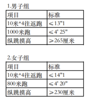 (二)體能測(cè)試項(xiàng)目和標(biāo)準(zhǔn):