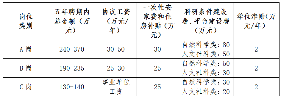 按照學(xué)校有關(guān)文件精神,與學(xué)校簽訂人才引進協(xié)議,兌現(xiàn)人才待遇。其中,博士可申報A、B、C三類崗位,相關(guān)待遇如下: