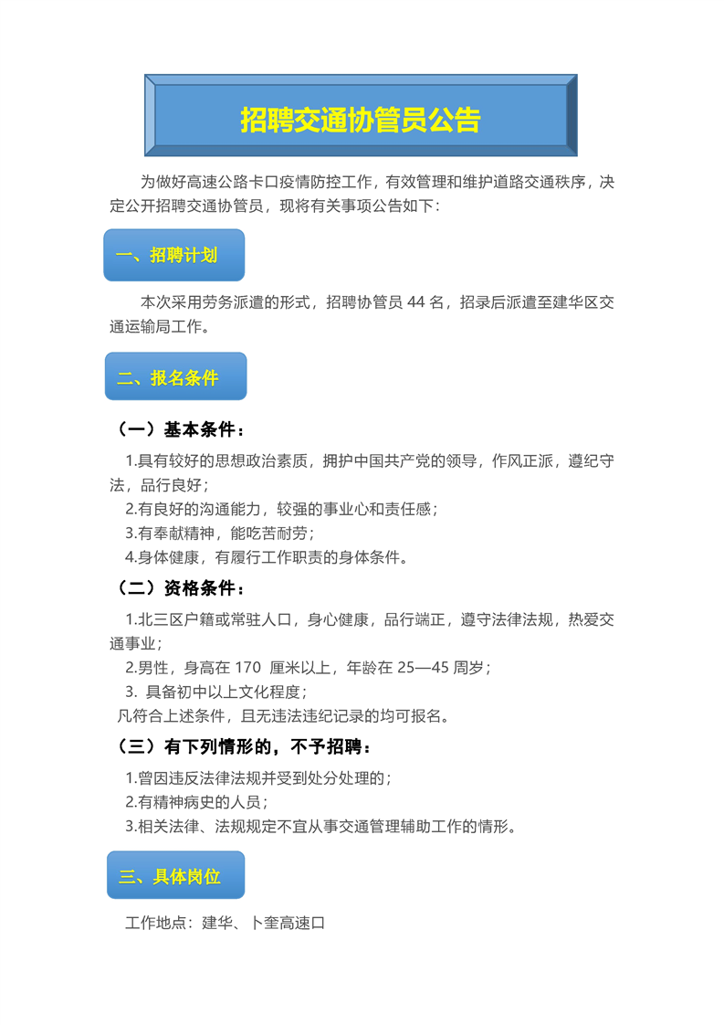 本次采用勞務(wù)派遣的形式,招聘協(xié)管員44名,招錄后派遣至建華區(qū)交通運(yùn)輸局工作。