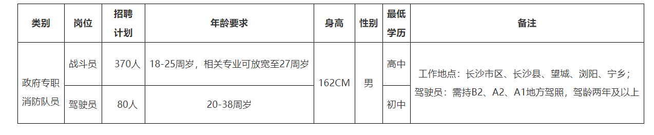 12、聘用人員與長沙市消防救援支隊(duì)簽訂勞動(dòng)合同,其工資福利待遇按《關(guān)于長沙市政府專職消防員工資福利待遇的意見》(長人社發(fā)〔2020〕32號(hào)文件)執(zhí)行,社保按照企業(yè)社會(huì)保險(xiǎn)政策繳納,住房公積金按長沙市住房公積金管理相關(guān)政策繳納。