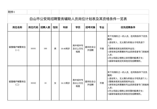 1.白山市公安局招聘警務(wù)輔助人員崗位計(jì)劃表及其資格條件一覽表