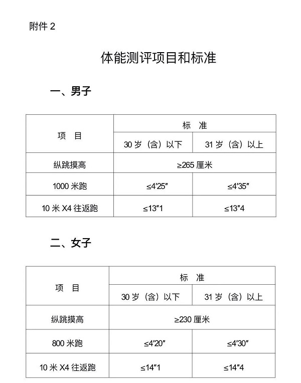 3.體能測評項(xiàng)目和標(biāo)準(zhǔn):按照《公安機(jī)關(guān)錄用人民警察體能測評項(xiàng)目和標(biāo)準(zhǔn)(暫行)》執(zhí)行,項(xiàng)目為:10米×4往返跑、縱跳摸高、男子1000米跑/女子800米跑,須三項(xiàng)測試均達(dá)標(biāo)為合格,詳見《體能測評項(xiàng)目和標(biāo)準(zhǔn)》(附件2)。不適宜劇烈運(yùn)動(dòng)或有隱形疾病的不得參加體能測試,否則后果自負(fù);