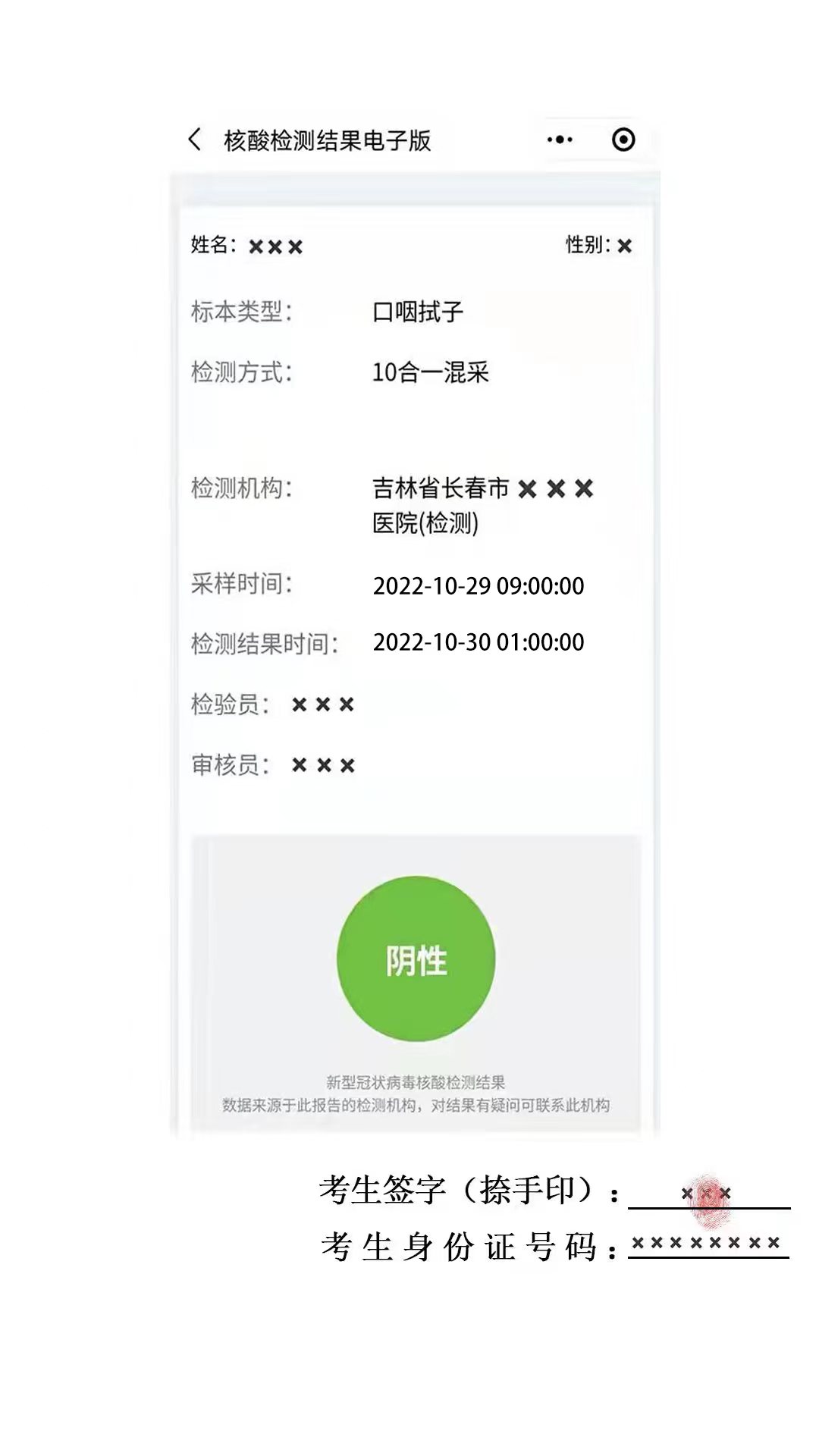 (三)所有應試人員在進入考點時應接受“吉祥碼”“通信大數(shù)據行程卡”“核酸檢測報告”查驗及體溫測量??忌仨殧y帶入場前24小時內(以采樣時間為準)長春市檢測機構出具的新冠病毒核酸檢測陰性證明參加考試。證明須為長春市有資質的檢測機構出具的,能明確顯示核酸檢測報告時間的紙質報告或打印紙質版的“吉事辦”小程序核酸檢測結果截圖(圖例見附件5,需注明姓名、身份證號并由本人簽字捺手印)。