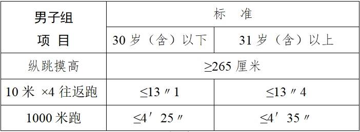 3.體能測(cè)評(píng)項(xiàng)目及標(biāo)準(zhǔn):本次招聘體能測(cè)評(píng)共三項(xiàng):縱跳摸高、10米×4往返跑、長(zhǎng)跑(男子1000米跑)。體能測(cè)評(píng)參照《公安機(jī)關(guān)錄用人民警察體能測(cè)評(píng)項(xiàng)目和標(biāo)準(zhǔn)(暫行)》執(zhí)行,采取達(dá)標(biāo)制。