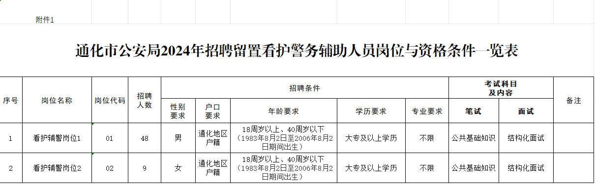 附件:1.通化市公安局2024年招聘留置看護(hù)警務(wù)輔助人員崗位與資格條件一覽表