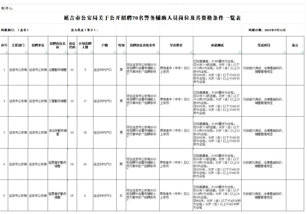 招聘崗位、人員數(shù)量及資格條件等見附件《延吉市公安局2023年招聘警務(wù)輔助人員崗位與資格條件一覽表》。