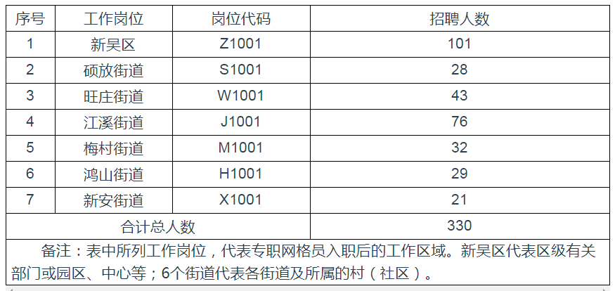 本次招聘專(zhuān)職網(wǎng)格員共330名,具體崗位分配如下: