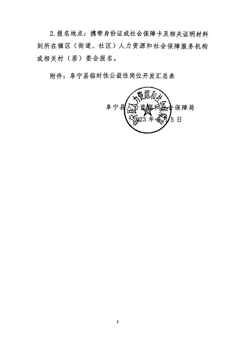 2023-05-06 16:23:32閱讀()阜寧縣人民政府為進(jìn)一步推動我縣就業(yè)困難人員就業(yè),根據(jù)《關(guān)于做好2023年度公益性崗位安置就業(yè)工作的通知》(阜人社〔2023)14號)要求,由用人單位提出申請并經(jīng)縣人力資源社會保障部門認(rèn)定,全縣共開發(fā)314個臨時性公益性崗位(詳見附件),現(xiàn)面向社會公開招聘就業(yè)困難人員。