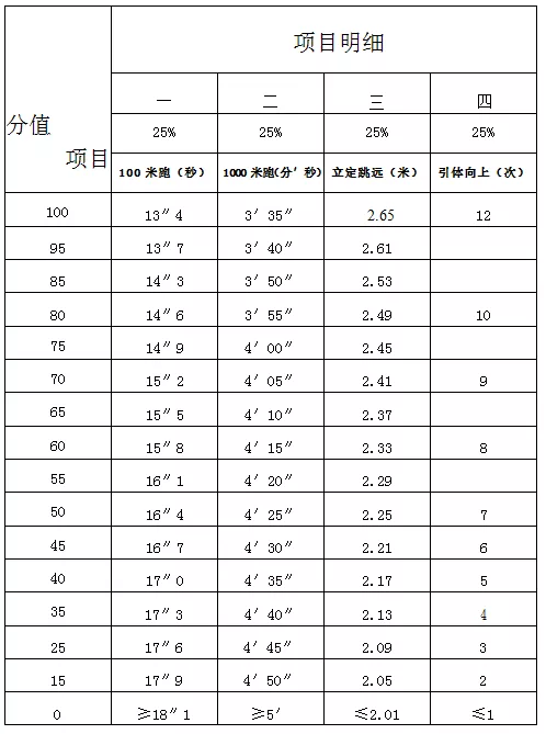 (3)測試項目:1000米跑、100米跑、立定跳遠、引體向上各占25分的權重分值(評分標準見附件二)。