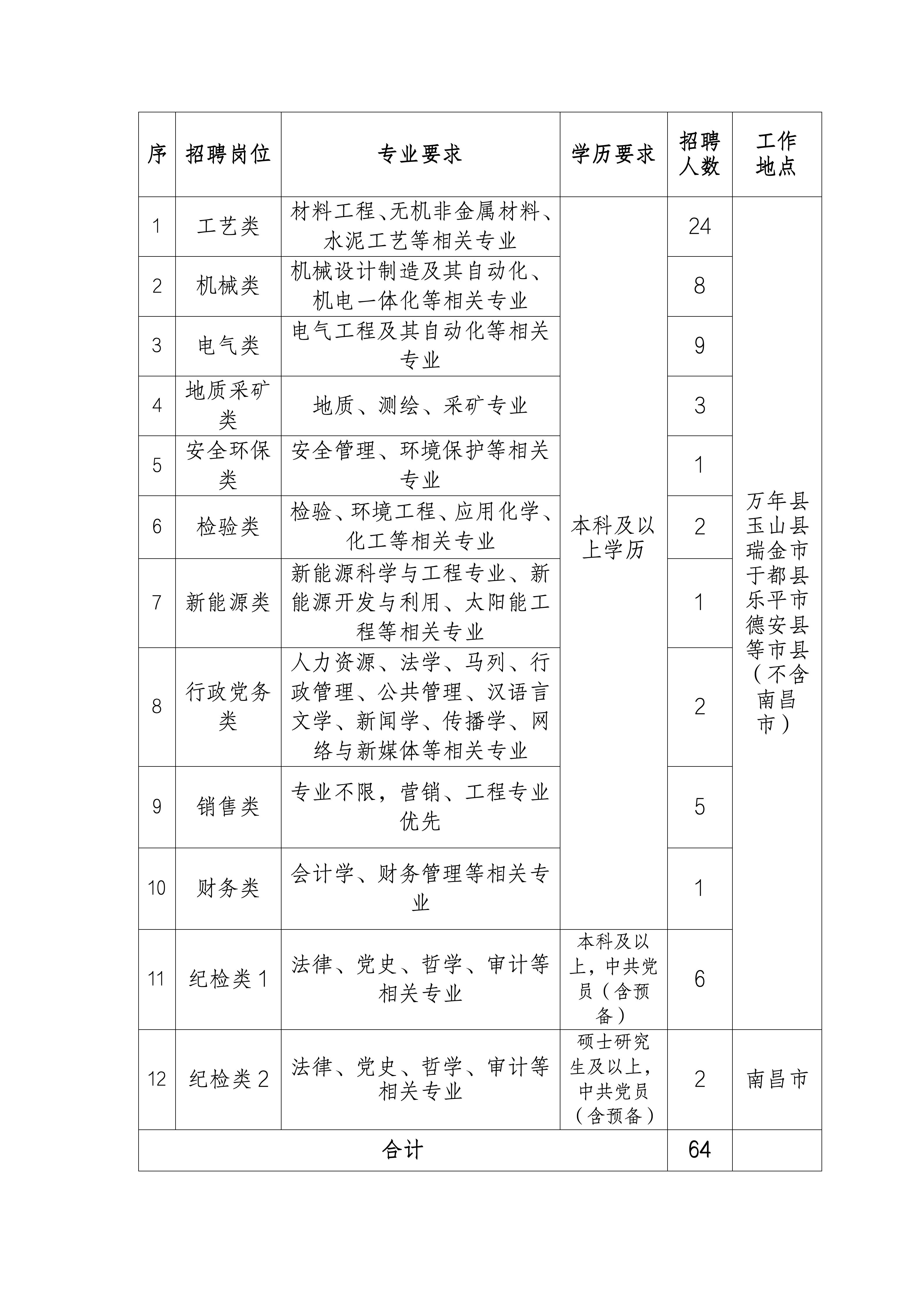 為滿足公司的生產經營需求,面向社會公開招聘,本次招聘崗位類別12個,招聘人數(shù)共計64人,人員分配到江西省內下屬各生產基地。