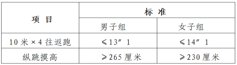 測評方法為:準(zhǔn)備測試階段,受測者雙腳自然分開,呈站立姿勢。接到指令后,受測者屈腿半蹲,雙臂盡力后擺,然后向前上方快速擺臂,雙腿同時發(fā)力,盡力垂直向上起跳,同時單手舉起觸摸固定的高度線或高度標(biāo)識,觸摸到高度線或者高度標(biāo)識的視為合格。測試不超過三次。
