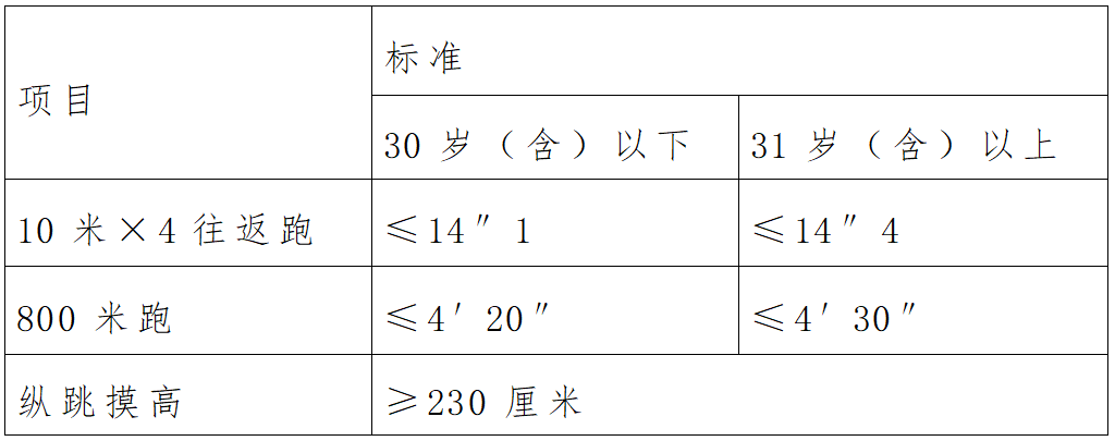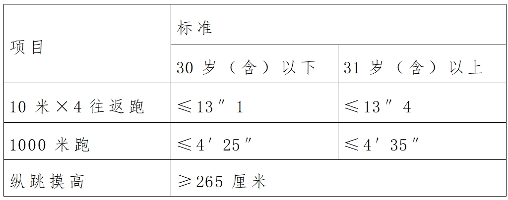 1.體能測試入圍人員:資格復(fù)審合格人員參加體能測試。