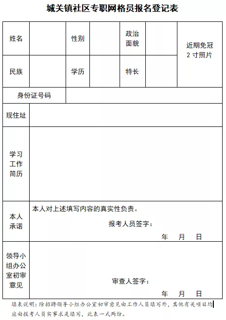 1.《城關鎮(zhèn)社區(qū)專職網(wǎng)格員報名登記表》一式二份;