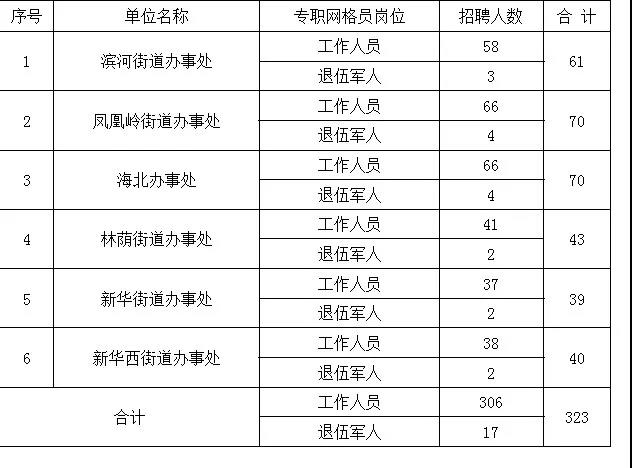 本次計(jì)劃公開(kāi)招聘專職網(wǎng)格員323人,其中:烏海市海勃灣區(qū)濱河街道辦事處61人,鳳凰嶺街道辦事處70人,海北街道辦事處70人,林蔭街道辦事處43人,新華街道辦事處39人,新華西街道辦事處40人。每人只限報(bào)考一個(gè)崗位。