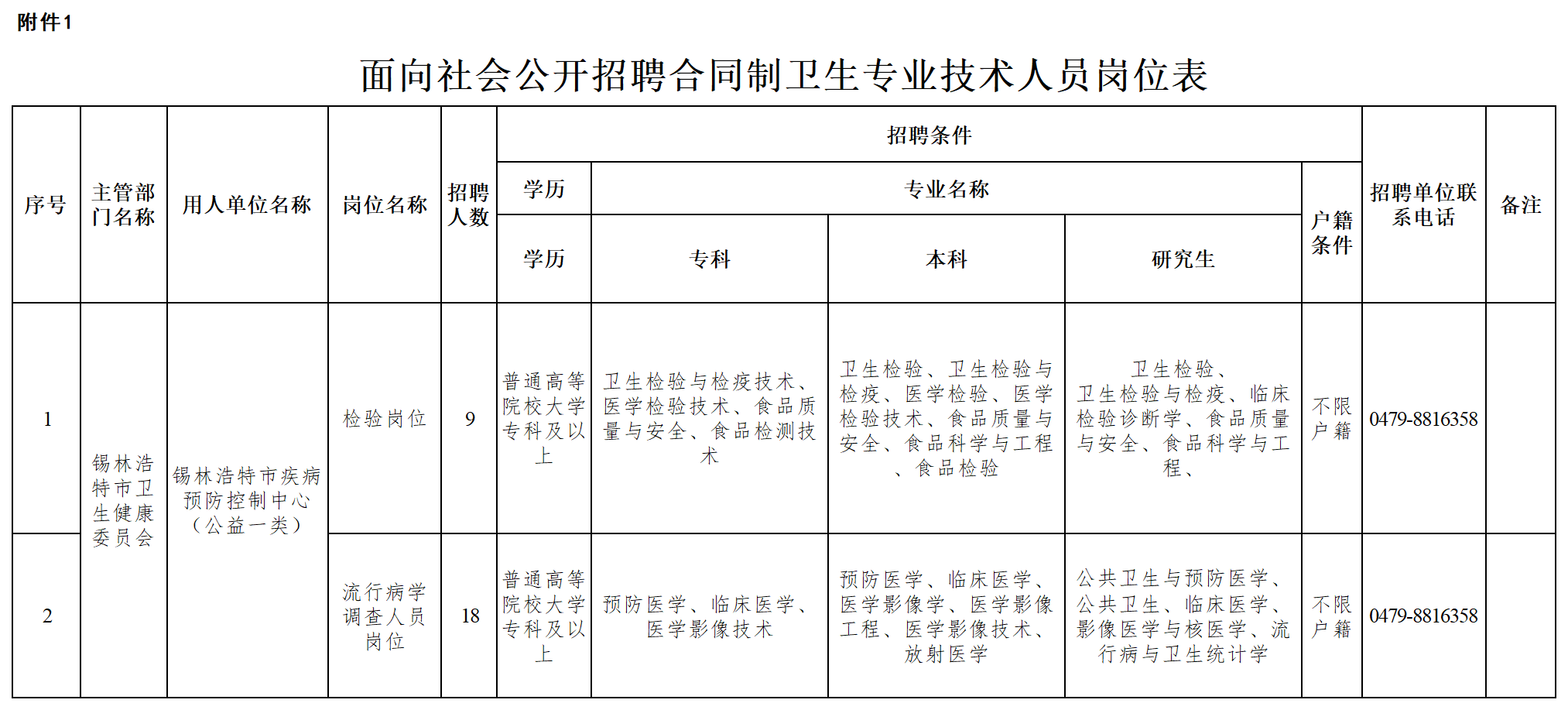 本次錫林浩特市疾病預(yù)防控制中心面向社會(huì)公開招聘合同制衛(wèi)生專業(yè)技術(shù)人員27人(其中:檢驗(yàn)崗位9人、流行病學(xué)調(diào)查人員崗位18人)詳見附件1。