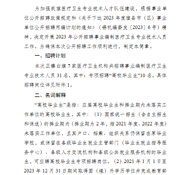 本次正鑲白旗7家醫(yī)療衛(wèi)生機構共招聘事業(yè)編制醫(yī)療衛(wèi)生專業(yè)技術人員31名,其中:專項招聘“高校畢業(yè)生”10名。具體招聘崗位詳見附件1。
