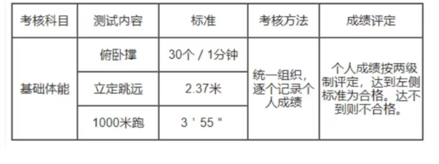 體能測試主要項目:1000米跑、仰臥起坐、立定跳遠(yuǎn),各項目測試標(biāo)準(zhǔn)如下: