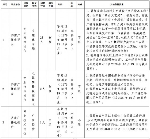 根據(jù)事業(yè)發(fā)展需要,濟(jì)南廣播電視臺(tái)擬面向社會(huì)公開(kāi)招聘專(zhuān)業(yè)技術(shù)崗位工作人員30人,均為事業(yè)編制。
