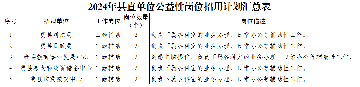 公益性崗位是指各級(jí)人民政府使用財(cái)政資金統(tǒng)一設(shè)置的非營利性公共管理類、公共服務(wù)類、社會(huì)事業(yè)類、設(shè)施維護(hù)類、社會(huì)治理類等崗位。2024年度費(fèi)縣計(jì)劃招聘城鎮(zhèn)公益性崗位10人(具體崗位見附件1)。