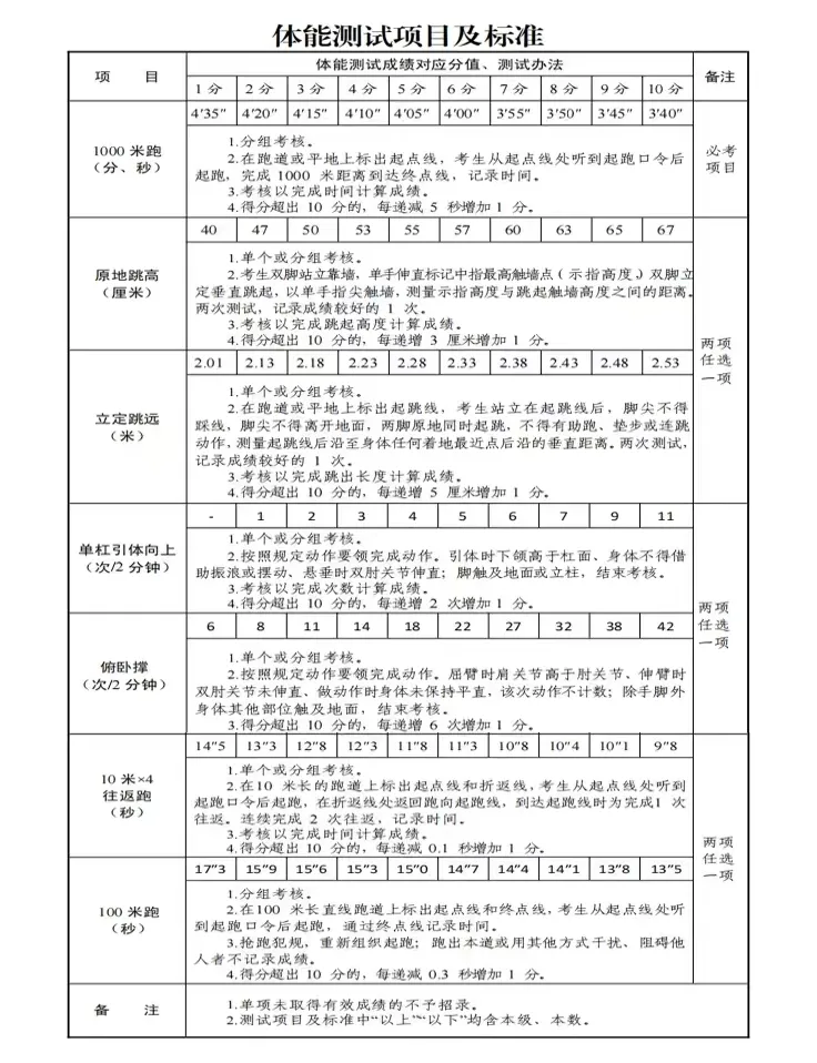 01體能、體型測試:標準參照《國家綜合性消防救援隊伍消防員招錄體能測試、崗位適應(yīng)性測試項目及標準》執(zhí)行。考核項目為:1000米跑必考項;原地跳高、立定跳遠,兩項選一項;單杠引體向上、俯臥撐,兩項選一項;10米×4往返跑、100米跑兩項選一項。主要考察招收對象肌肉力量、肌肉耐力和爆發(fā)力等。