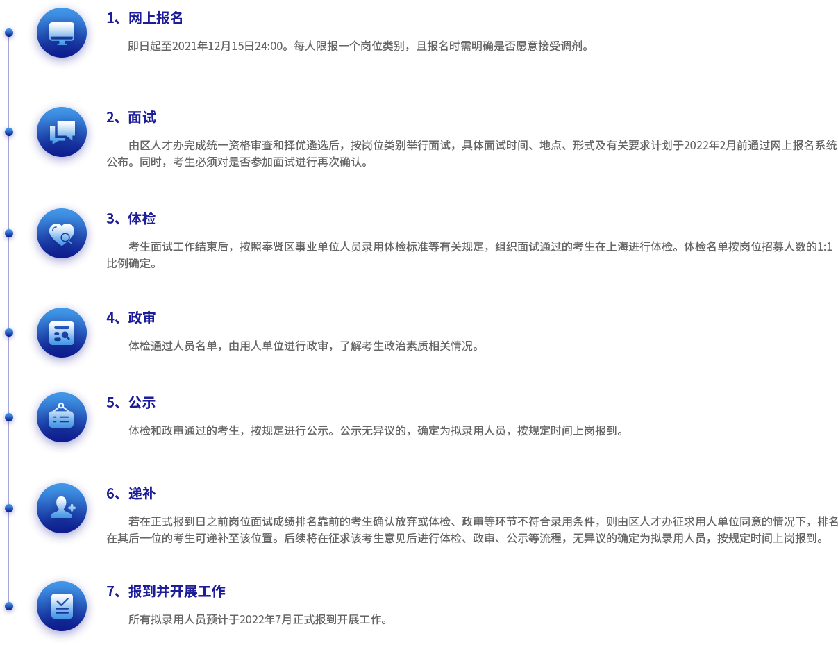 1.選調生結合儲備人才項目同步開展,統(tǒng)一采取網(wǎng)上報名,網(wǎng)上報名時間截止到2021年11月10日24:00。 2.在規(guī)定時間內成功報名“奉賢區(qū)定向選調生”的人員,經(jīng)奉賢區(qū)委組織部綜合遴選后,按一定比例擇優(yōu)推薦參加上海市定向選調考試,與上海市2022年度考試錄用公務員筆試一并進行(一考兩用,即筆試成績可同時在選調生招錄和上海市2022年度考試錄用公務員中使用)。 3.經(jīng)上海市選調生筆試、面試、體檢、考察、公示、錄用等相關程序后,辦理選調生公務員錄用手續(xù)。錄用職位根據(jù)人崗相適原則,由區(qū)委組織部統(tǒng)一安排。 4.選調生正式錄用后,區(qū)委組織部負責安排選調生進行為期兩年的基層培養(yǎng)鍛煉(其中第一年為試用期),按照大學生村官進行管理。試用期滿考核合格的,按照相關規(guī)定進行轉正定級;不合格的,將取消錄用。 5.報名參加選調的應屆畢業(yè)生,應如實填報個人信息、提供任職和獲獎證明材料。凡弄虛作假的,一律取消選調資格。