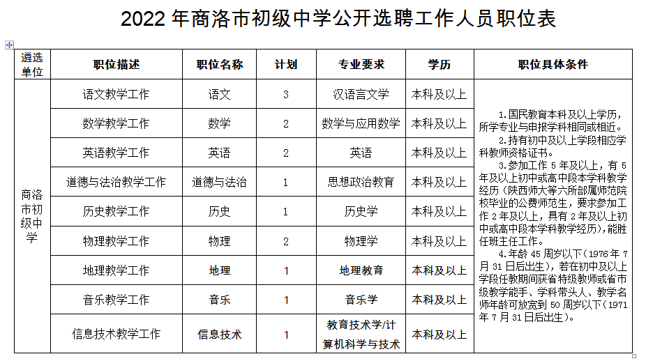 1.2022年商洛市初級中學公開選聘工作人員職位表