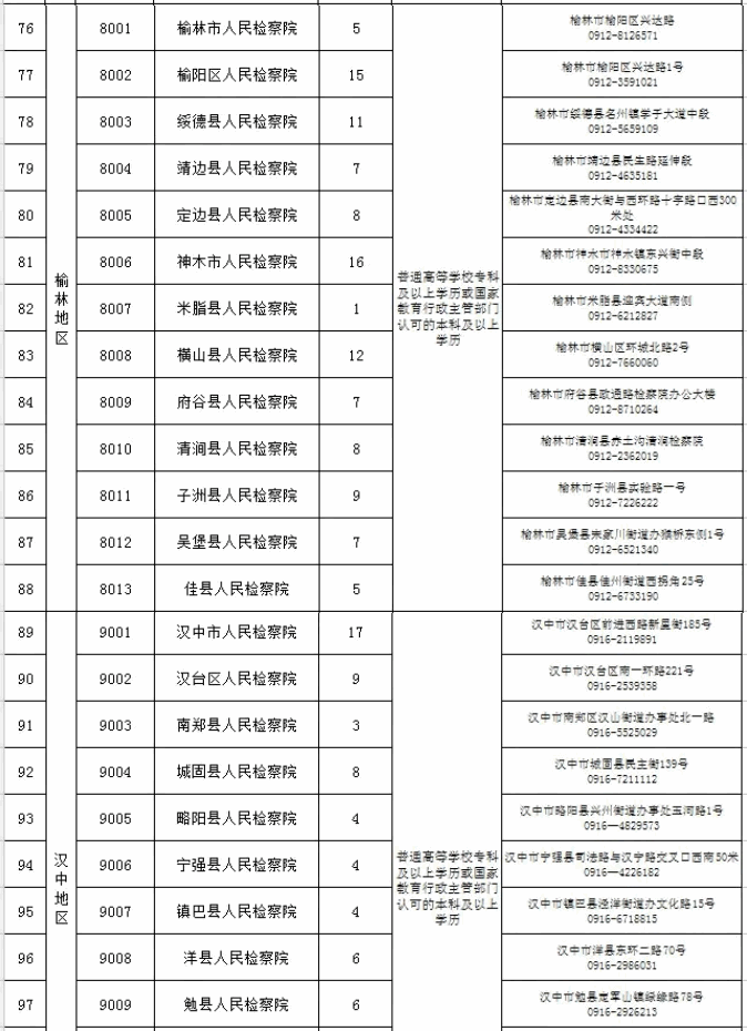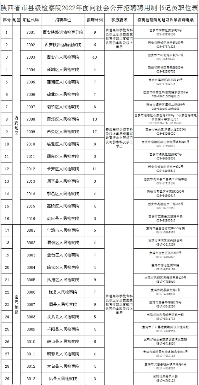 陜西省市縣級(jí)檢察院2022年面向社會(huì)公開招聘聘用制書記員職位表