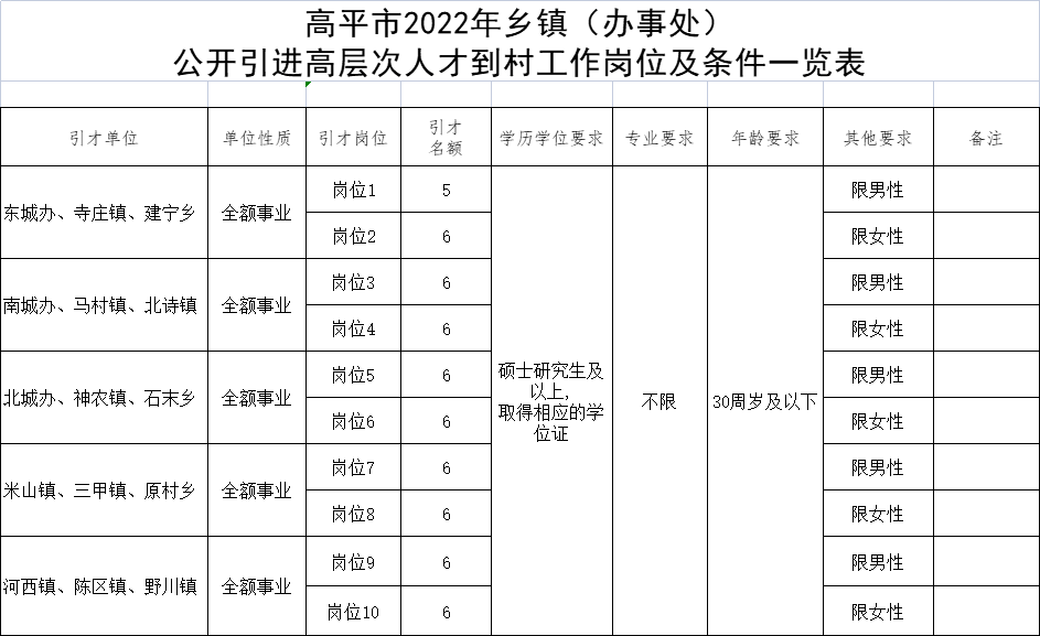 附件1:《高平市2022年鄉(xiāng)鎮(zhèn)(辦事處)公開引進(jìn)高層次人才到村工作崗位及條件一覽表》