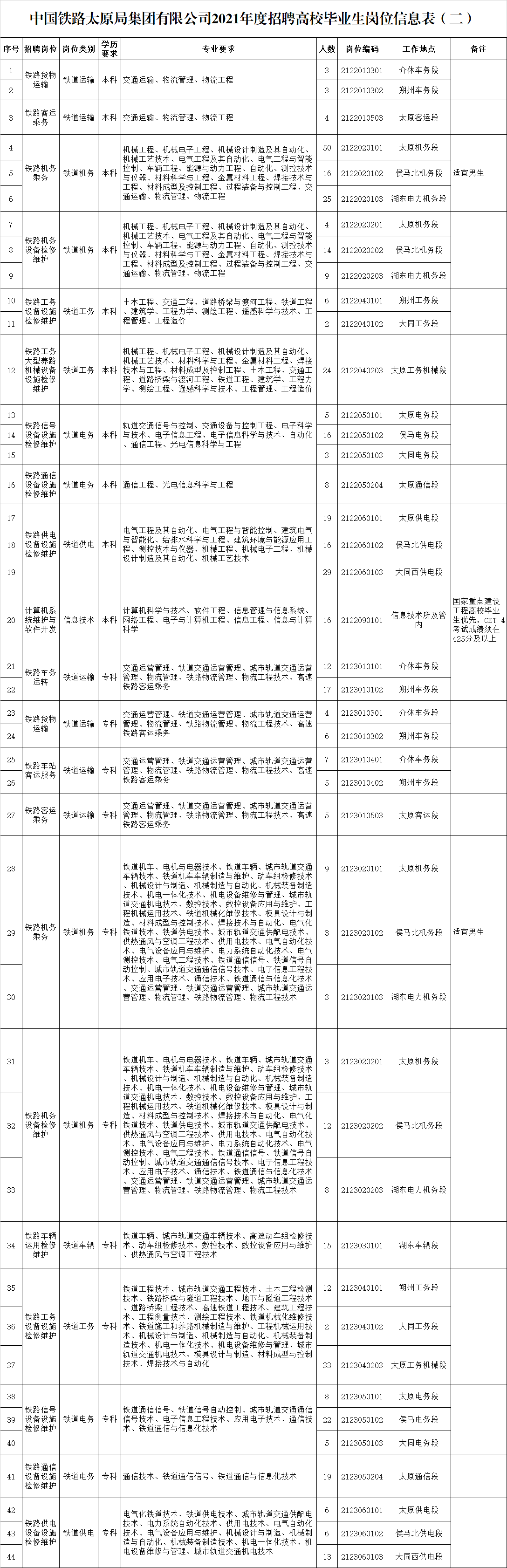 招聘崗位、學(xué)歷、專業(yè)、人數(shù)和工作地點(diǎn)等內(nèi)容詳見(jiàn)《中國(guó)鐵路太原局集團(tuán)有限公司2021年度招聘高校畢業(yè)生崗位信息表(二)》。